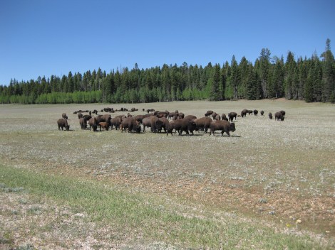 Right after we entered the Grand Canyon National Park we look over into a big field and we see our second buffalo herd of the trip. Of course we had to stop for 20 minutes and watch them eat. The car behind us-an interesting family. I overhead a 12 year old girl say she wanted to go out into the field and touch one, maybe ride one. I overhead an adult from that group way that the buffalo were ‘migrating” Alright. Anyhow both Mrs Postcard and I took dozens of pictures of the buffalo and watched them for a while before heading down to the north rim.