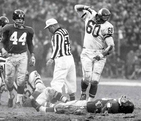 The hardest hit I have ever seen on the football field is Chuck Bednarik’s hit on Gifford in the 1960 season. Gifford suffered severe head injuries and retired, he would come back in 1962. The picture of Bednarik standing over Gifford after the hit is one of the iconic photos in NFL history. Some of his teammates thought Gifford was dead. One story goes that after the game they were on their way to the locker room. They pass a room with a body on a cot, covered with a white sheet, they thought it was Frank. Turns out a fan had died of a heart attack during the game.
